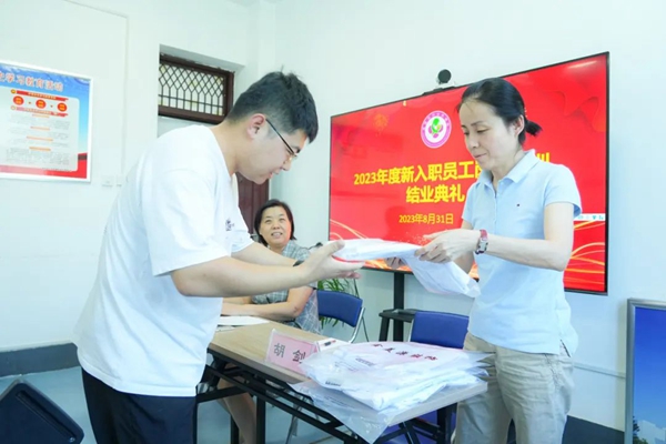 院領(lǐng)導(dǎo)為全體新入職員工授予工作服、工作證。