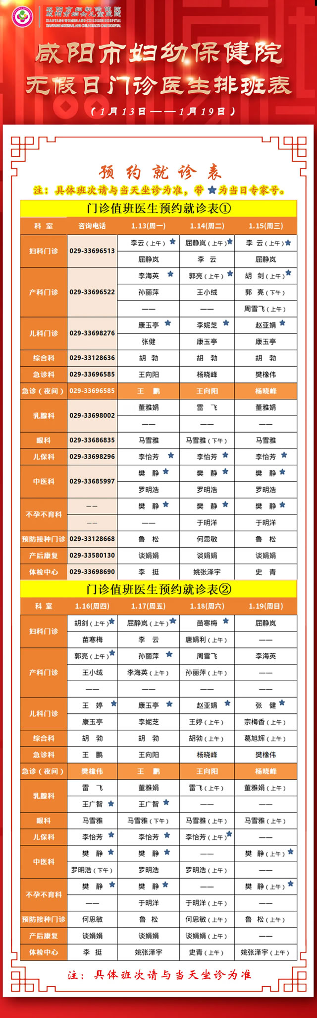 咸陽市婦幼保健院無假日門診醫(yī)生排班表(1月13日-1月19日)
