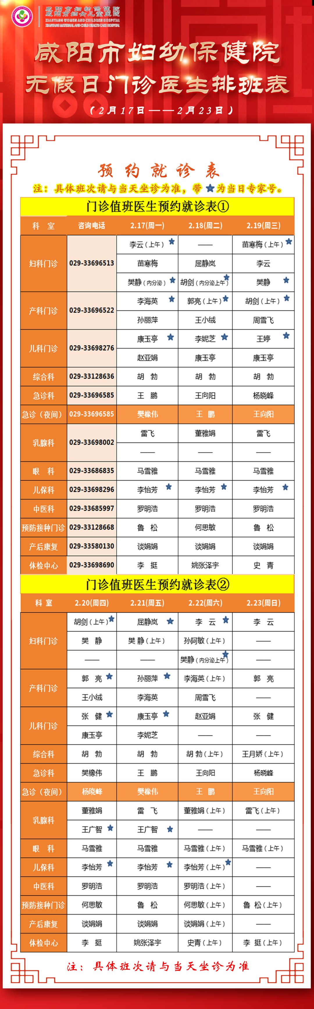 咸陽市婦幼保健院無假日門診醫(yī)生排班表(2月17日-2月23日)