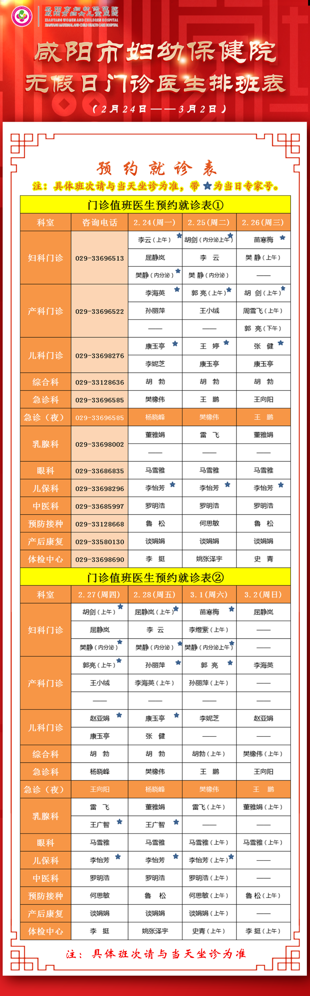 咸陽市婦幼保健院無假日門診醫(yī)生排班表(2月24日-3月2日)