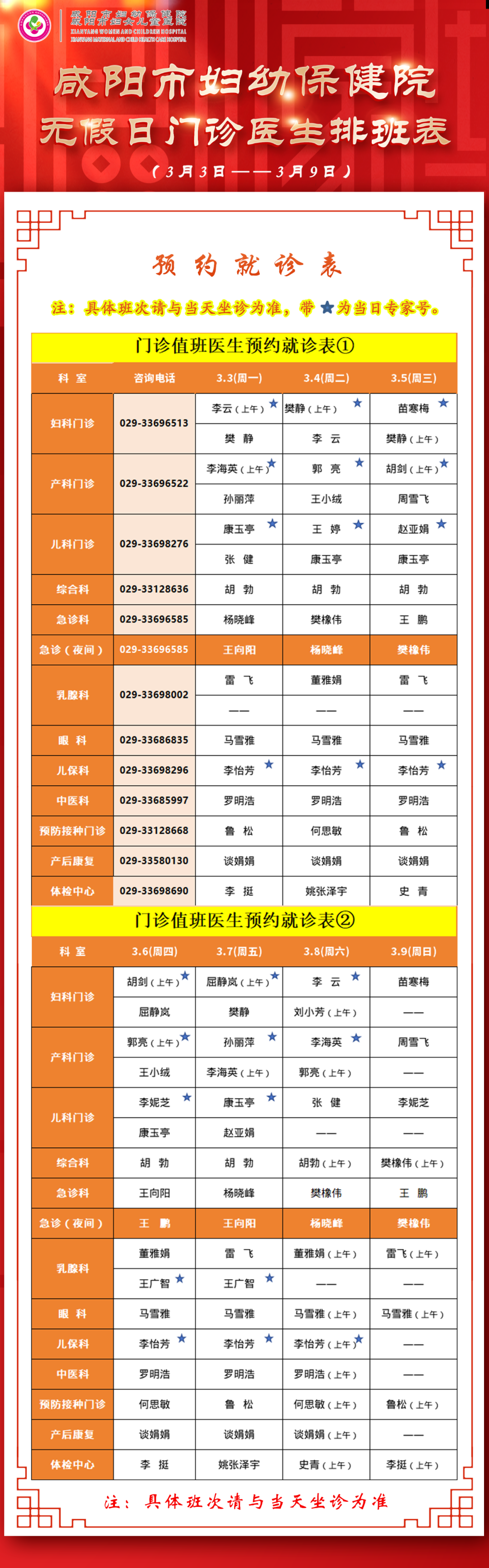 咸陽市婦幼保健院無假日門診醫(yī)生排班表(3月3日-3月9日)