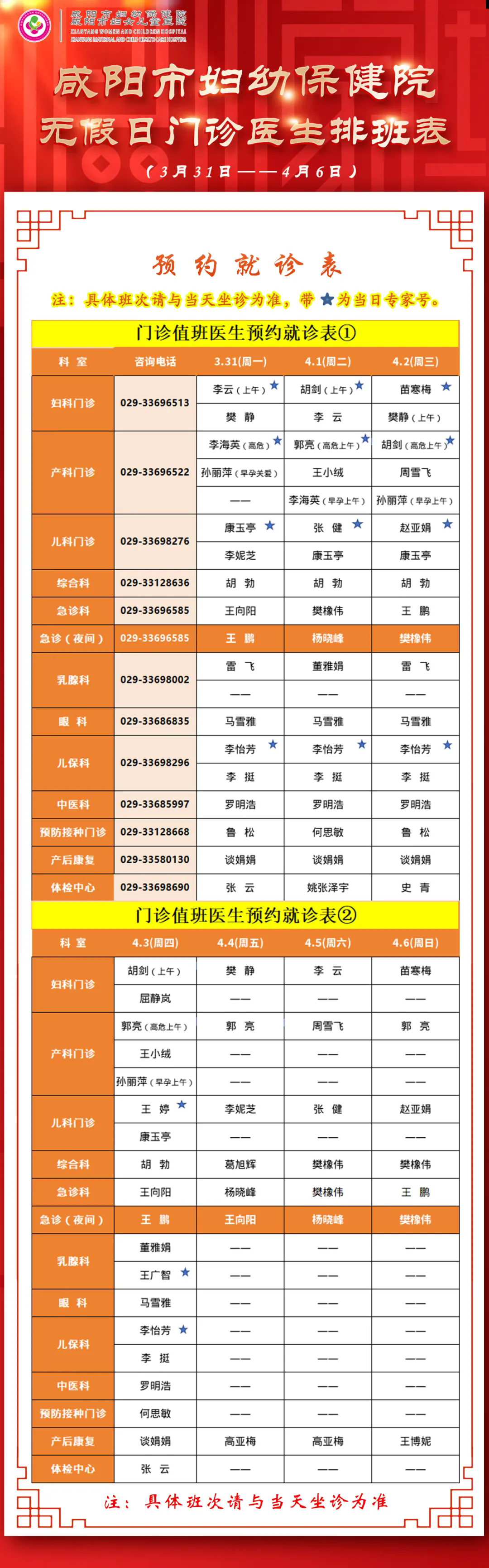 咸陽市婦幼保健院無假日門診醫(yī)生排班表(3月31日-4月6日)