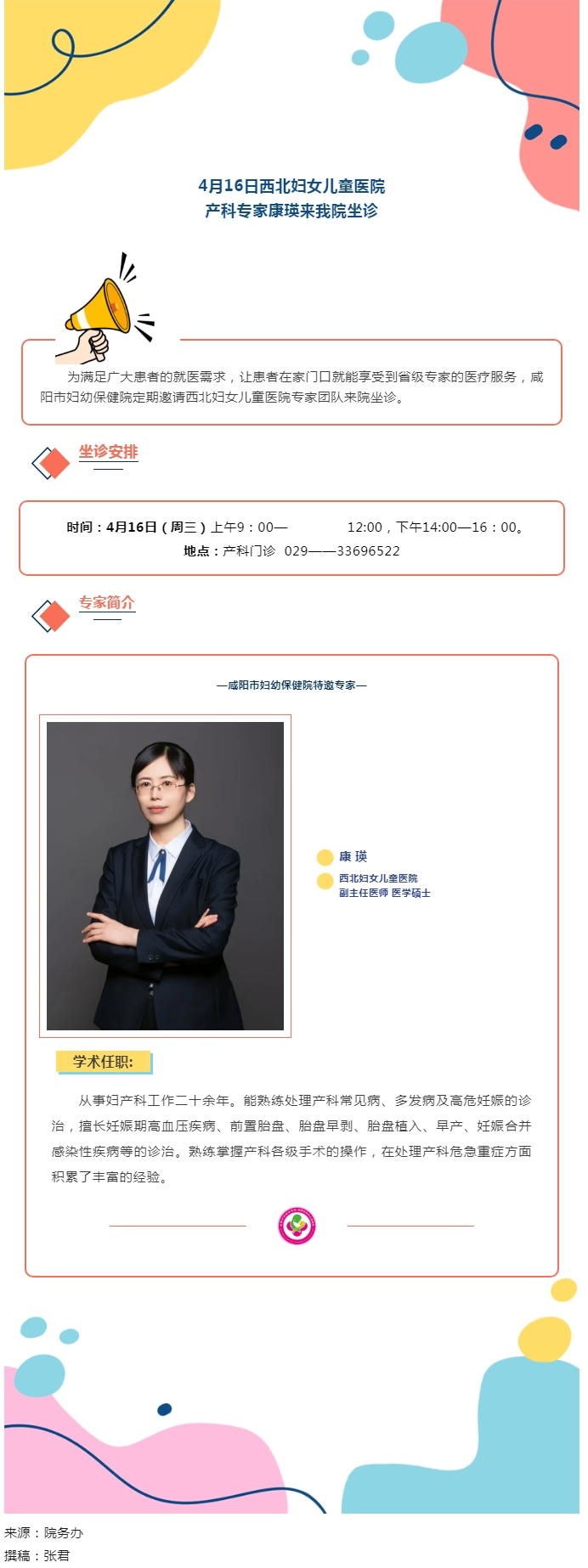 4月16日西北婦女兒童醫(yī)院產(chǎn)科專家康瑛來我院坐診