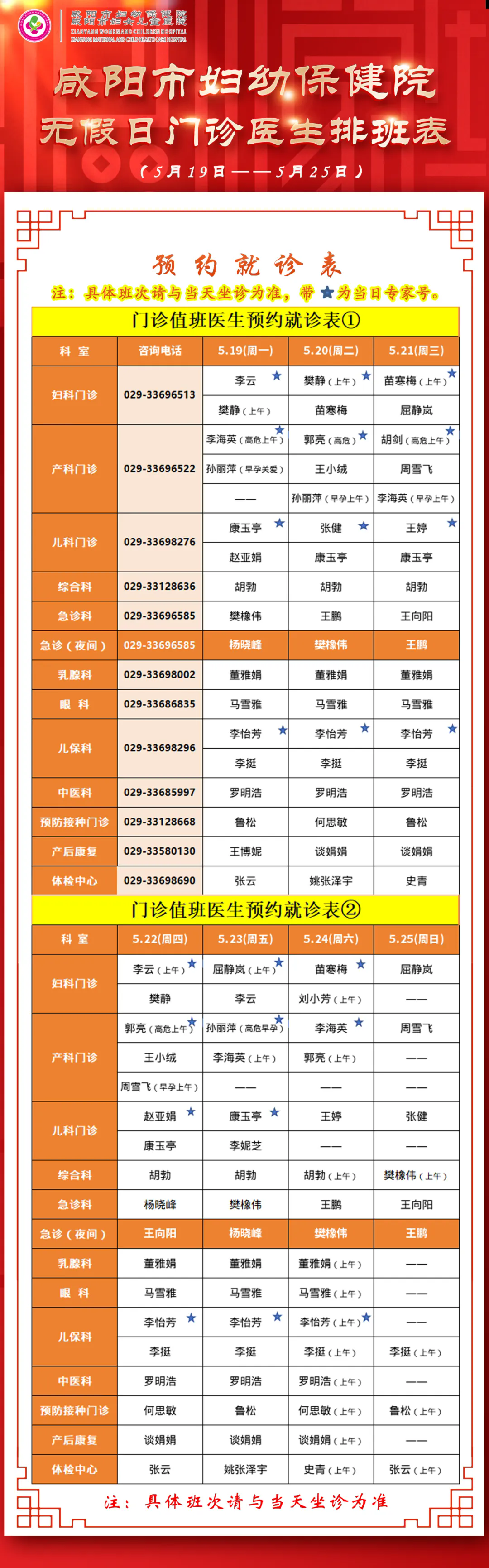 咸陽市婦幼保健院無假日門診醫(yī)生排班表(5月19日-5月25日)