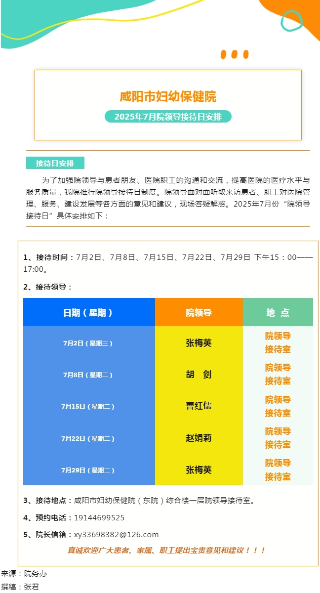 咸陽市婦幼保健院2025年7月院領(lǐng)導接待日安排