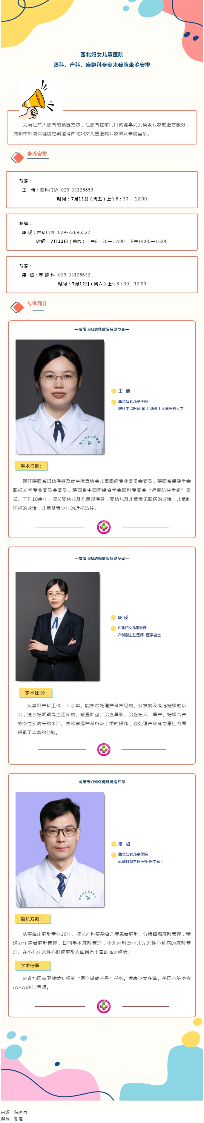 7月11日、12日西北婦女兒童醫(yī)院眼科、產(chǎn)科、麻醉科專家來我院坐診安排
