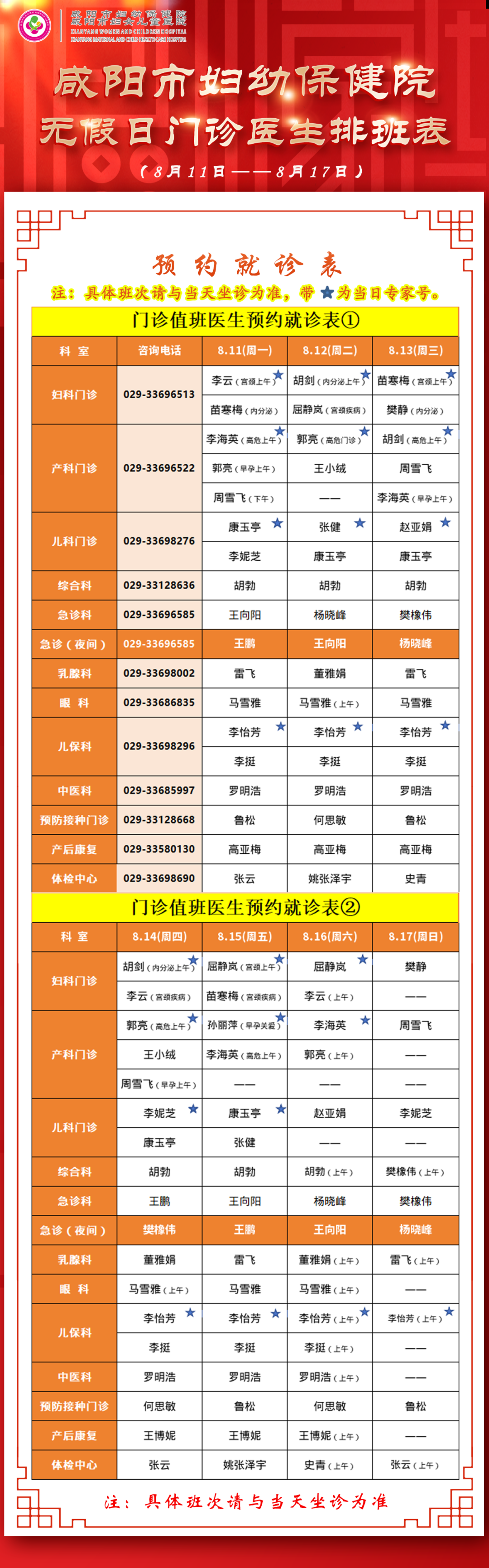 咸陽(yáng)市婦幼保健院無(wú)假日門(mén)診醫(yī)生排班表(8月11日-8月17日)
