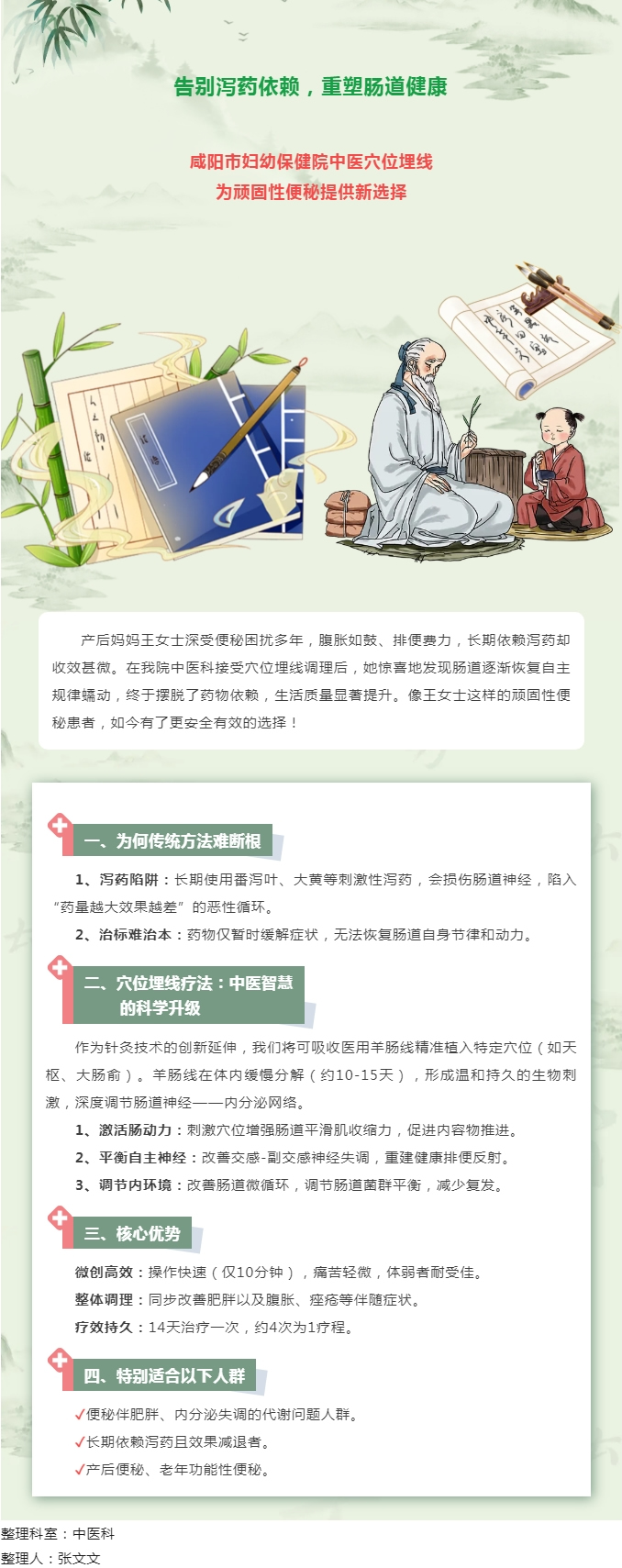 告別瀉藥依賴,重塑腸道健康:咸陽市婦幼保健院中醫(yī)穴位埋線為頑固性便秘提供新選擇