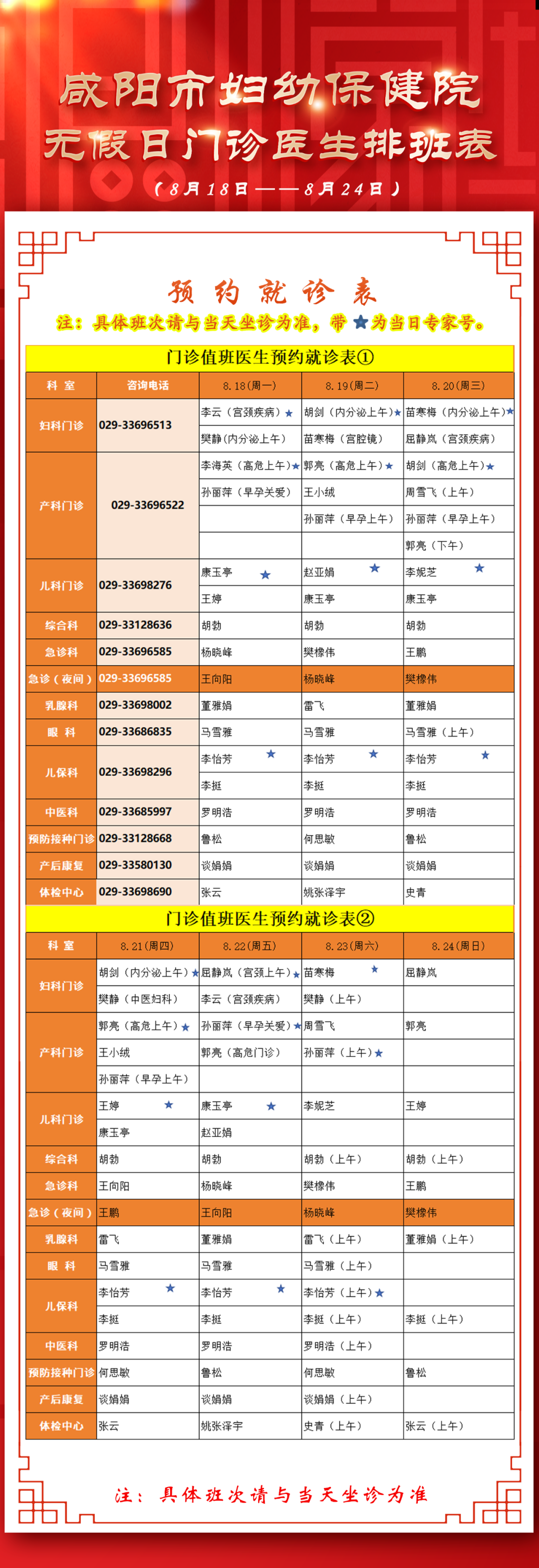 咸陽市婦幼保健院無假日門診醫(yī)生排班表(8月18日-8月24日)