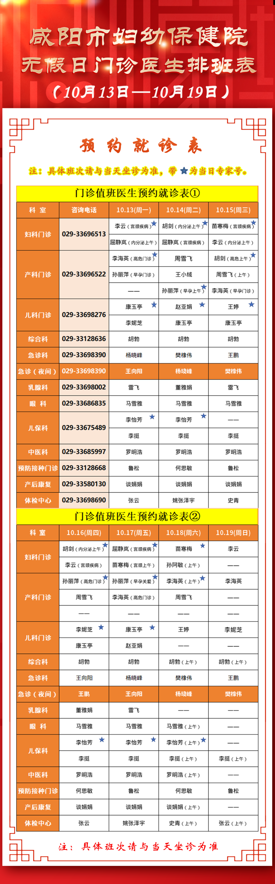 咸陽市婦幼保健院無假日門診醫(yī)生排班表(10月13日-10月19日)