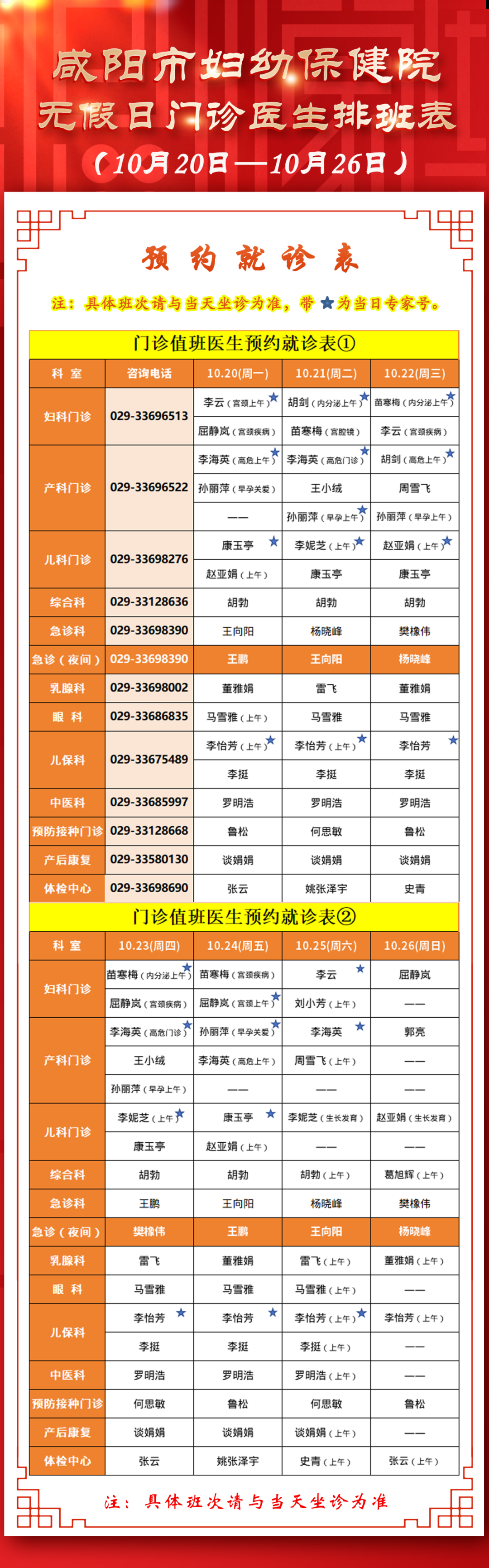 咸陽市婦幼保健院無假日門診醫(yī)生排班表(10月20日-10月26日)