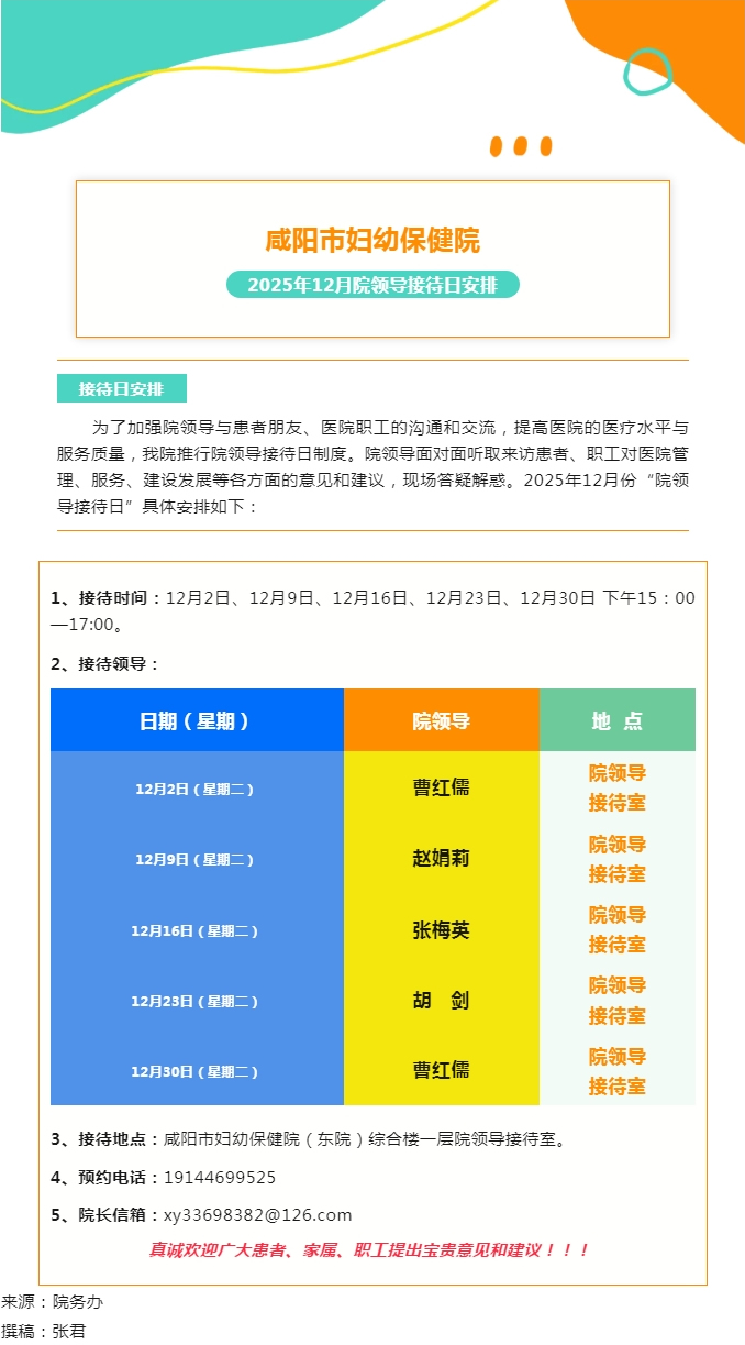咸陽(yáng)市婦幼保健院2025年12月院領(lǐng)導(dǎo)接待日安排