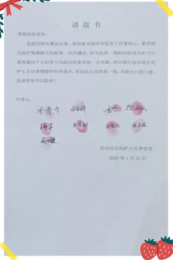 圖為可愛的護(hù)士姐妹們的“請戰(zhàn)書”